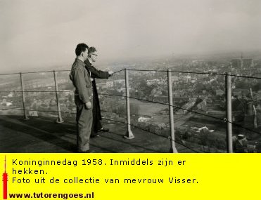 De echtgenoot van mevrouw Visser werkte op de televisietoren. Ze herinnert zich dat hij op Koninginnedag 1958 ook moest werken, omdat enkele parabolen werden geïnstalleerd. De parabolen werden gebruikt voor straalverbindingen.