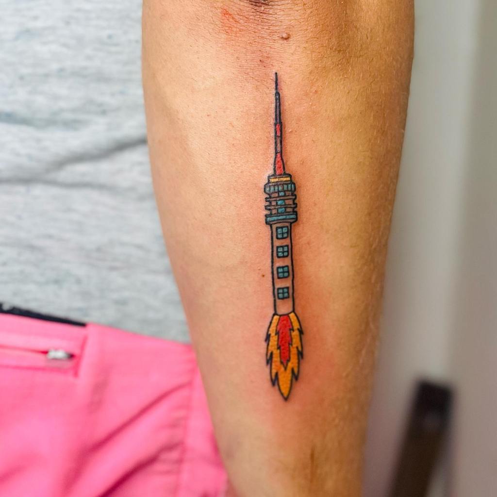Het was al vaker door zijn gedachten gegaan, maar toch was het besluit om de tattoo te laten zetten impulsief. “Ik moest bij Tattoo Kubus in Goes wat boxen brengen, en ze hadden er een flash day. Binnen een halfuur kon je vooraf gemaakte ontwerpjes op je arm laten zetten. De tv-toren wilde ik toch al, dus let’s go!