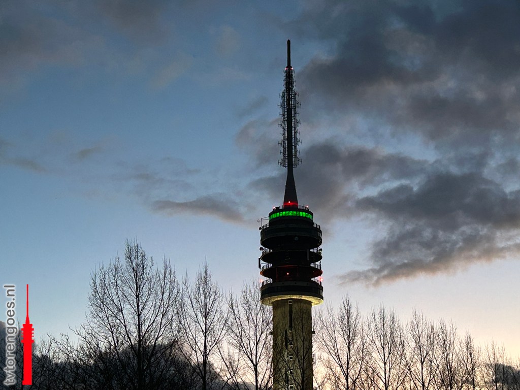 En daar staat de toren dan. Trots met zijn mast omhoog, met de nieuwe verlichting.