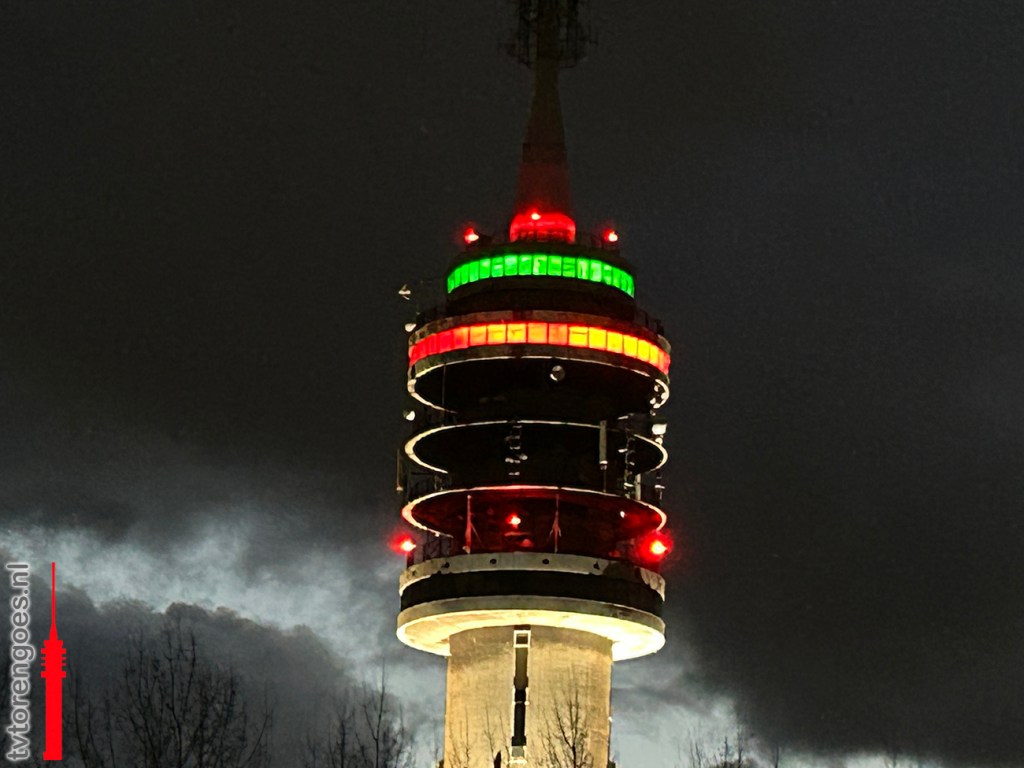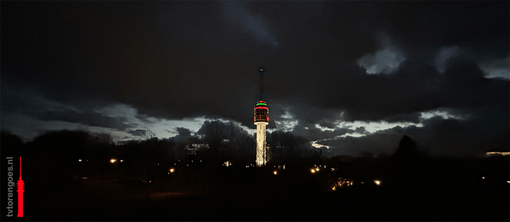 Het lijkt wel een lichtshow. Het eerste uur waarin de nieuwe verlichting van de tv-toren in Goes aan is, wordt er nog van alles ingeregeld. Aan-uit-knipperknipper. Het maakt in elk geval duidelijk dat de kleuren nu in een vloek en een zucht zijn aangepast.