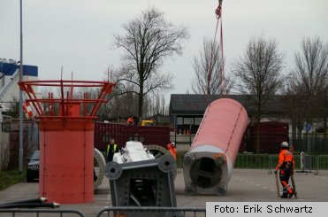 Honderden mensen zien hoe de vier stukken door de lucht zweven en op een parkeerterrein worden gezet. Drie grote ‘buizen’ en het ‘kraaienest’. Maar… wat dan?