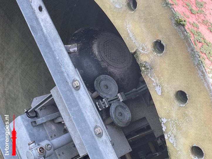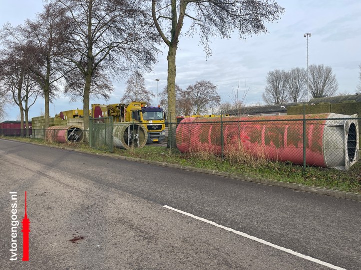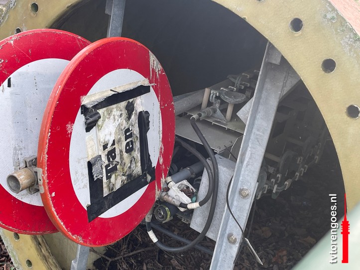 Vanaf het parkeerterrein brengt de gemeente de top naar het terrein van de milieustraat, een meter of dertig verderop. Daar liggen de drie buizen compleet met oude antennes er nog in, sinds die tijd (check door deze site in januari 2025). Je kunt ze zo zien van achter het hek. Sterker, je kunt ze bijna aanraken.