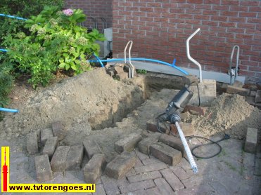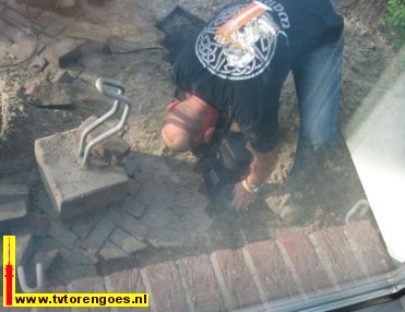 Op de foto’s: bij de Omroep Zeeland-studio in Oost-Souburg wordt in september 2006 de kabel aangelegd waarmee het tv-signaal naar de satelliet-uplink wordt vervoerd. Het is de blauwe kabel, de groene is de kabel voor de distributie van radio- en tv-programma’s naar de toren in Goes. Op de onderste foto wordt met een grote boor een gat geboord om de kabel naar binnen te krijgen.